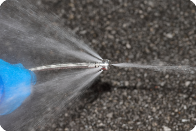 高圧洗浄機噴射口:実際に高圧水が噴射される様子を撮影。