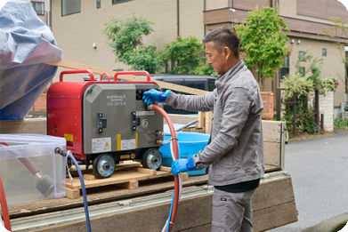 高圧洗浄機やホース、モニター機器など、現場に必要な機材を搬入・設置します。
